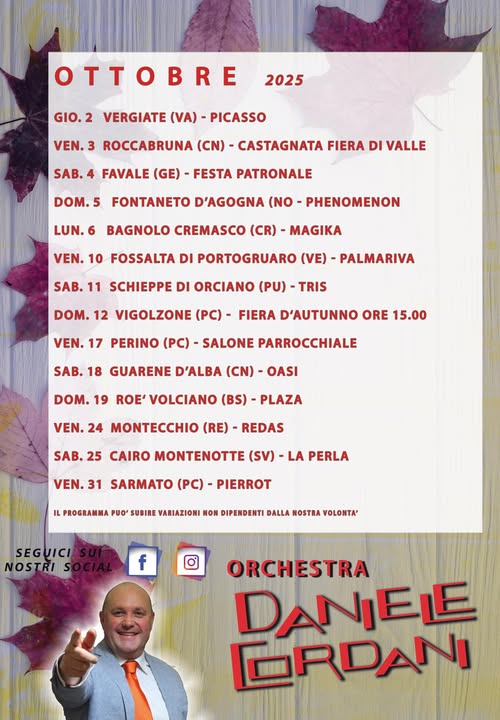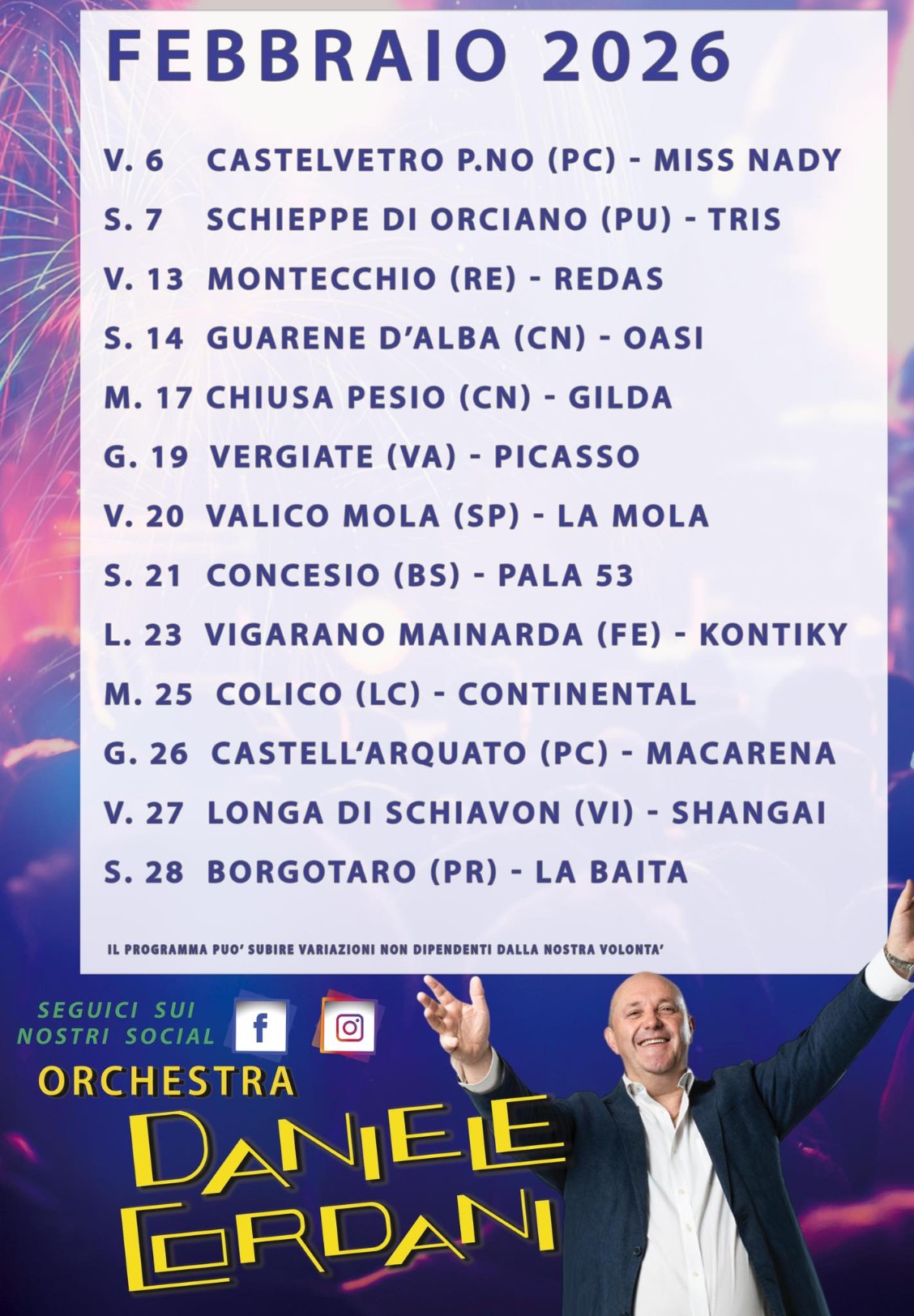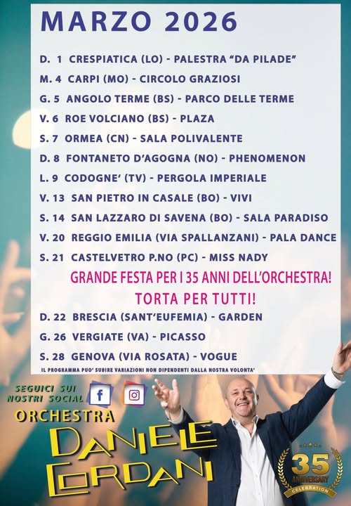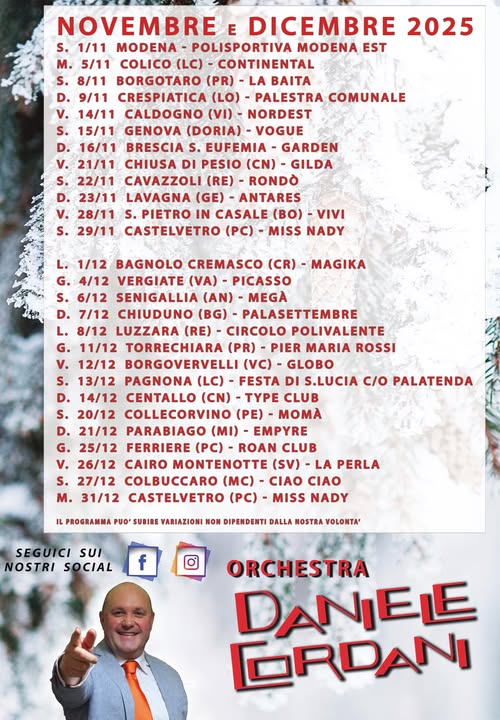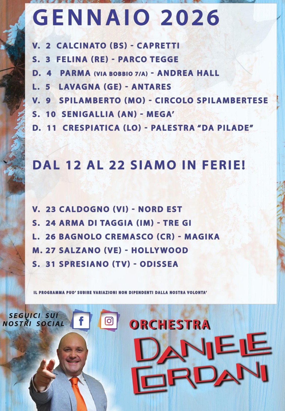 L'Orchestra CORDANI si scusa per eventuali cambiamenti che possono avvenire al calendario delle serate. In proposito consiglia a tutti gli amici che intendono seguirci di accertarsi telefonicamente o via E-MAIL sull'esattezza dell'indicazione pubblicata. Grazie DANIELE CORDANI